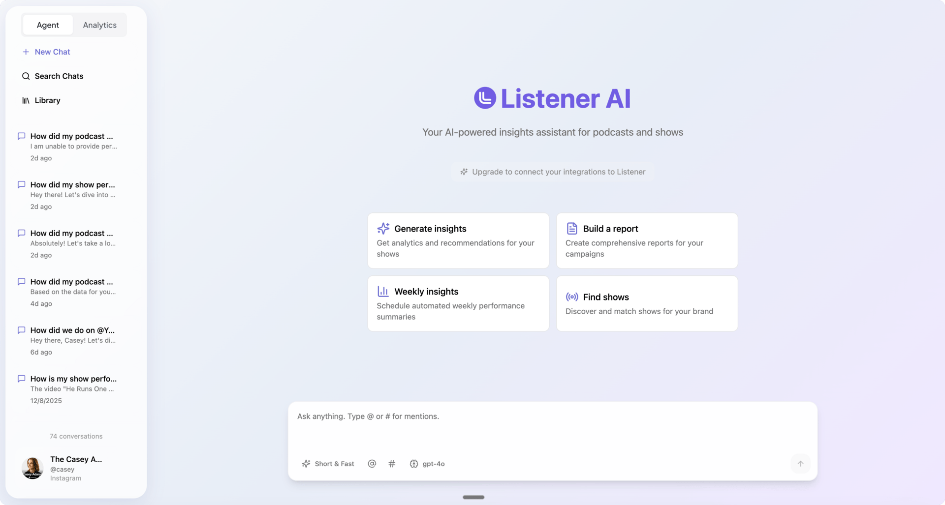 Listener AI lets you have a conversation with your podcast data across all of your shows and all connected platforms, including audio, long-form video, and short-form content.